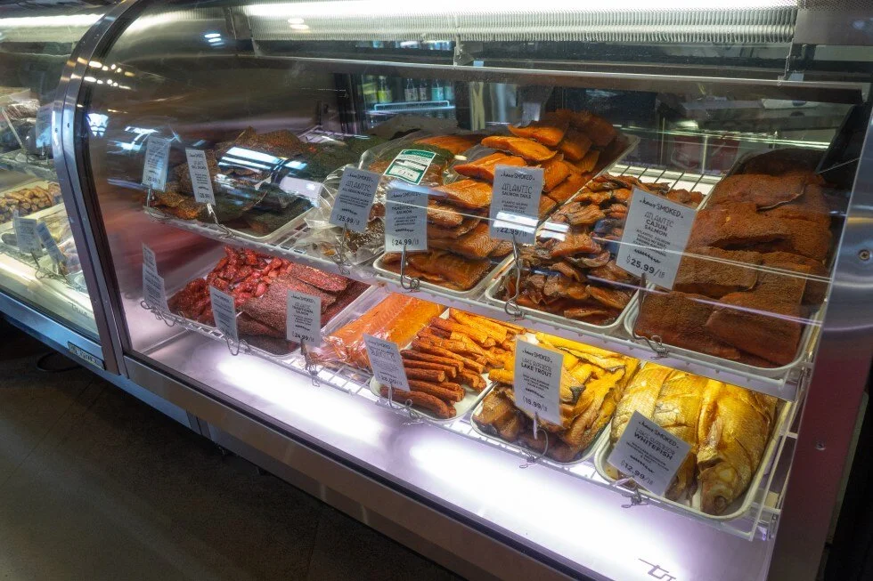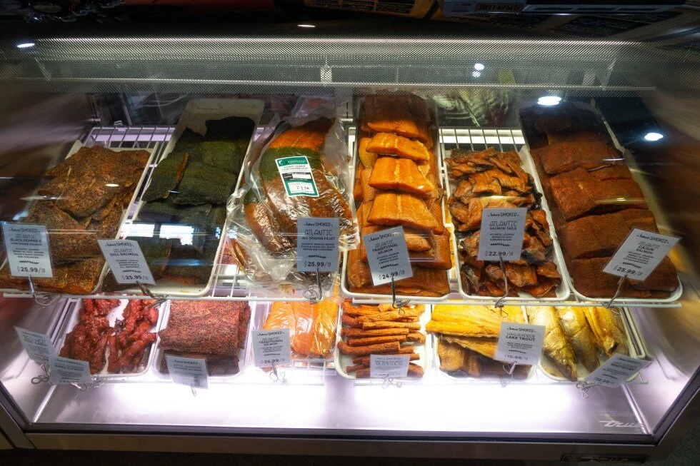 The fish case is now a replica of our smoked meat case, which we held onto from the NWR days. Lately, our fish case has been packed to the brim—with candied king salmon and smoked salmon sticks becoming NWS mainstays—almost to our detriment. Cramming a bunch of items in a small space and having to decide which things we stock does our product a disservice. Now that we have a bigger case, there should be no need to wonder whether there are All-Season Filets or Baby Tails. There is room for it all.