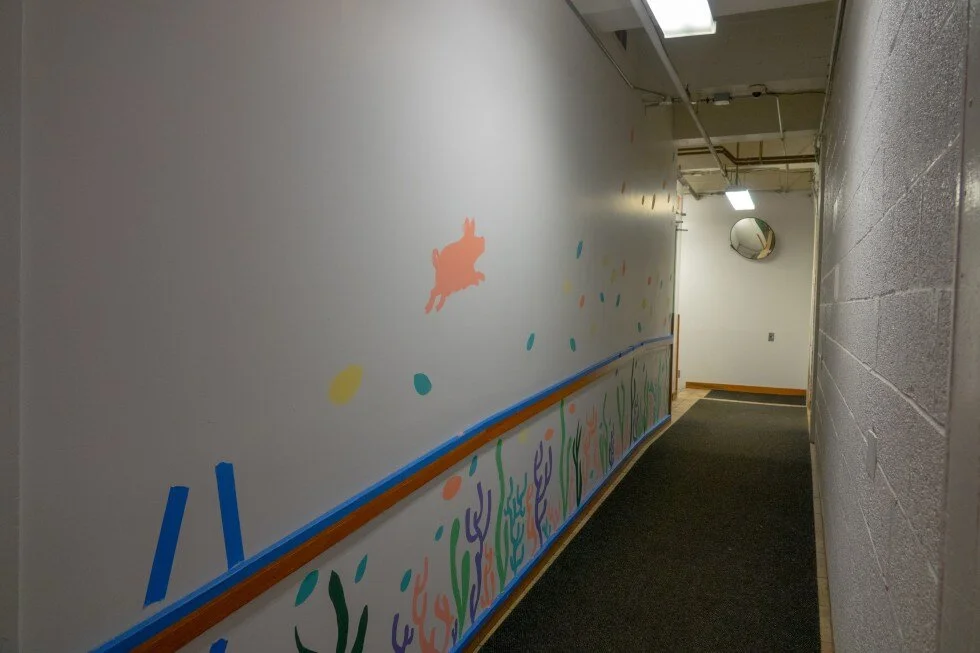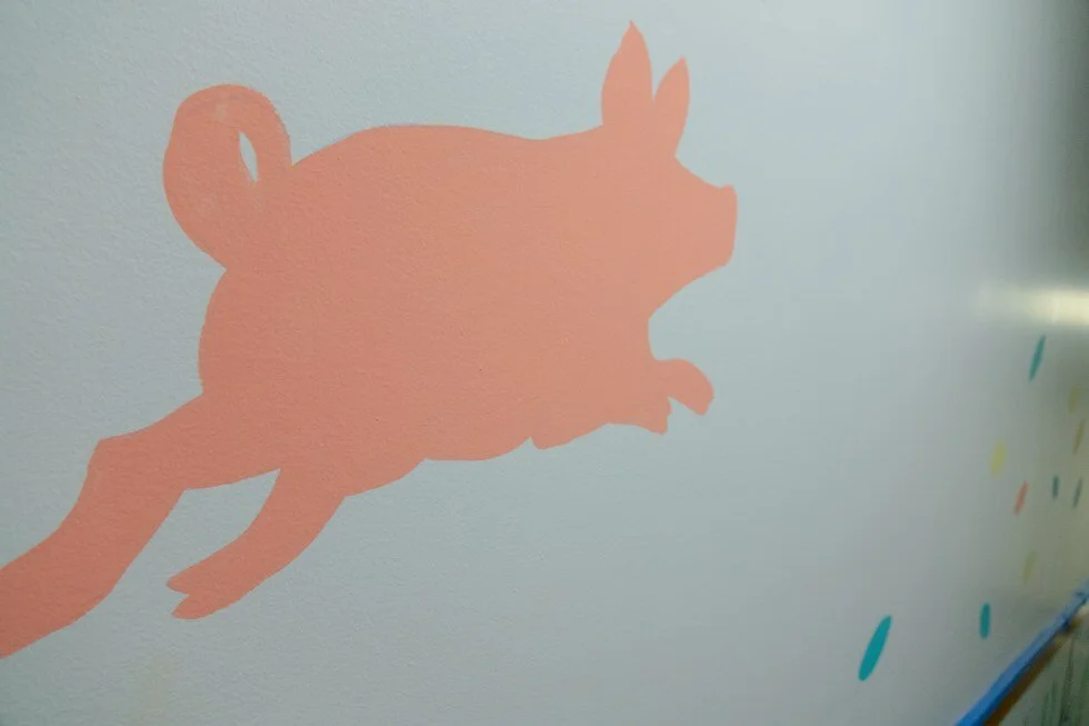 On the aesthetic front, we have new, larger, green and red respectively "Enter" and "Exit" signs (Summer lines! We are prepared for ye this time!) and Flo is painting a mural on our side of the hallway to the elevator. It was a drab hallway, though exceptional at its purpose—leading us to the elevator and service staircase—and in need of some love. Flo has been coming in at 6 a.m. every day to catch as many hours of empty hallway as possible, because Flo is amazing (and the illustrative voice of NWS). The mural—which features at least four very pleasant colors, and whimsical pigs and fish—will be hard to miss and easy to enjoy. I'm personally quite excited to observe the process each morning I come in to work.